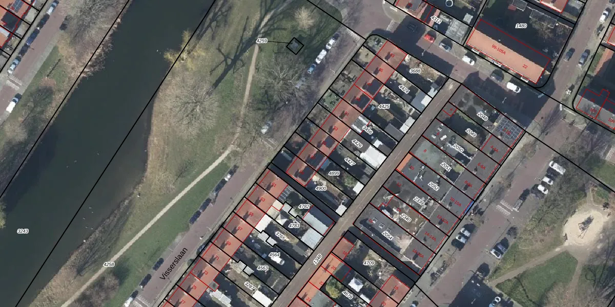 Visserslaan 57 is gelegen op kadastraal perceel AHM01E4899. Deze kadastrale aanduiding is uniek en wordt gebruikt door het Kadaster om eigendomsrechten en andere zakelijke rechten vast te leggen. Het perceel maakt onderdeel uit van de kadastrale gemeente Arnhem.