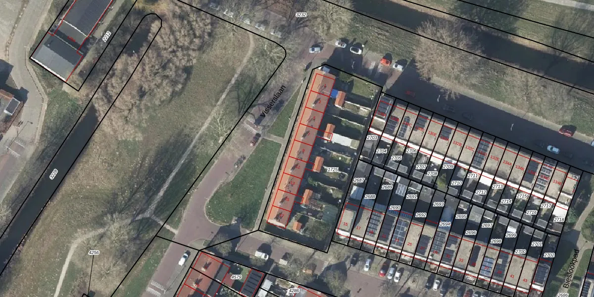 Het perceel waarop Visserslaan 9 staat heeft een oppervlakte van 1427 m². Dit is een zeer groot perceel. De perceeloppervlakte wordt geregistreerd door het Kadaster. Gedetailleerde informatie over de maten van dit perceel kunt u vinden in het rapport Kadastrale kaart met maatvoering van Visserslaan 9.