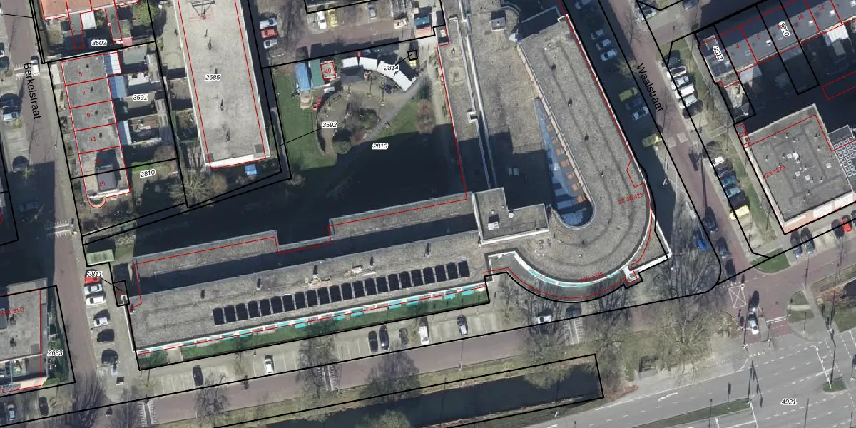Het perceel waarop Waalstraat 36-104 staat heeft een oppervlakte van 7390 m². Dit is een zeer groot perceel. De perceeloppervlakte wordt geregistreerd door het Kadaster. Gedetailleerde informatie over de maten van dit perceel kunt u vinden in het rapport Kadastrale kaart met maatvoering van Waalstraat 36-104.