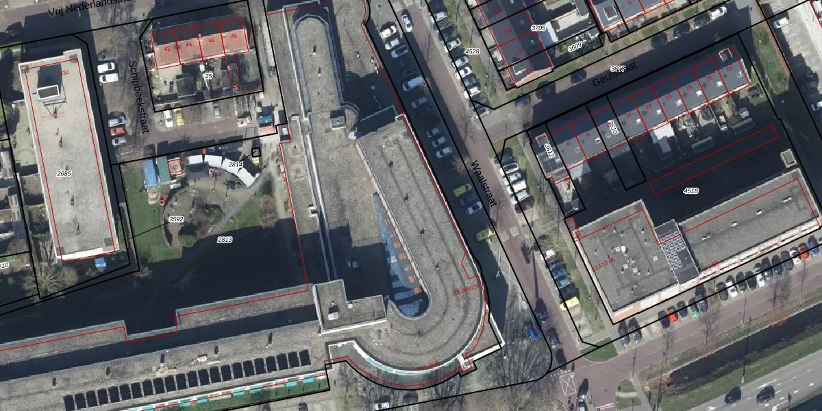 Het perceel waarop Waalstraat 36-143 staat heeft een oppervlakte van 7390 m². Dit is een zeer groot perceel. De perceeloppervlakte wordt geregistreerd door het Kadaster. Gedetailleerde informatie over de maten van dit perceel kunt u vinden in het rapport Kadastrale kaart met maatvoering van Waalstraat 36-143.