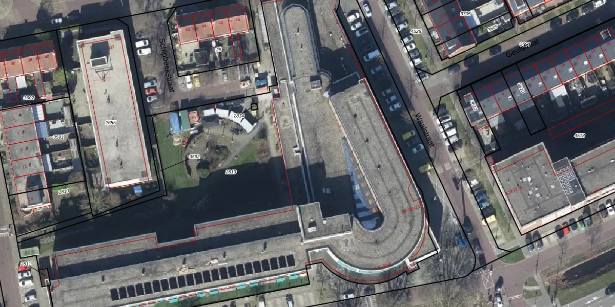Het perceel waarop Waalstraat 36-228 staat heeft een oppervlakte van 7390 m². Dit is een zeer groot perceel. De perceeloppervlakte wordt geregistreerd door het Kadaster. Gedetailleerde informatie over de maten van dit perceel kunt u vinden in het rapport Kadastrale kaart met maatvoering van Waalstraat 36-228.