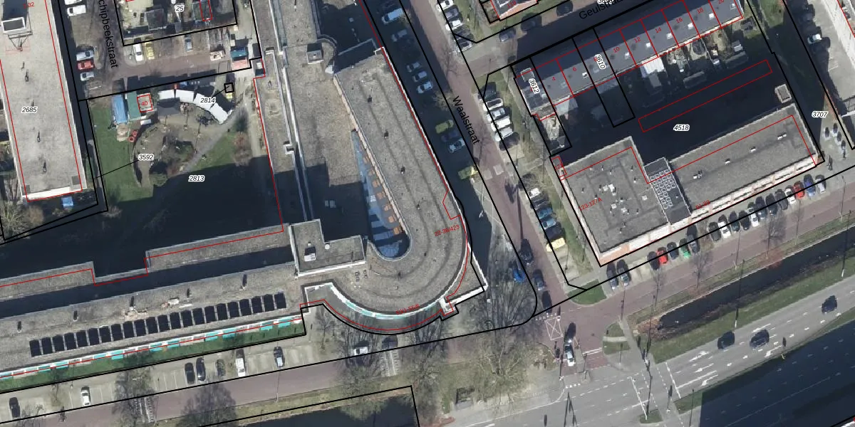 Het perceel waarop Waalstraat 36-233 staat heeft een oppervlakte van 7390 m². Dit is een zeer groot perceel. De perceeloppervlakte wordt geregistreerd door het Kadaster. Gedetailleerde informatie over de maten van dit perceel kunt u vinden in het rapport Kadastrale kaart met maatvoering van Waalstraat 36-233.