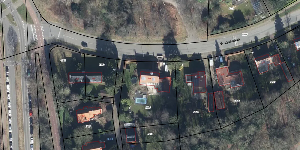 Het perceel waarop Wagnerlaan 116 staat heeft een oppervlakte van 1624 m². Dit is een zeer groot perceel. De perceeloppervlakte wordt geregistreerd door het Kadaster. Gedetailleerde informatie over de maten van dit perceel kunt u vinden in het rapport Kadastrale kaart met maatvoering van Wagnerlaan 116.