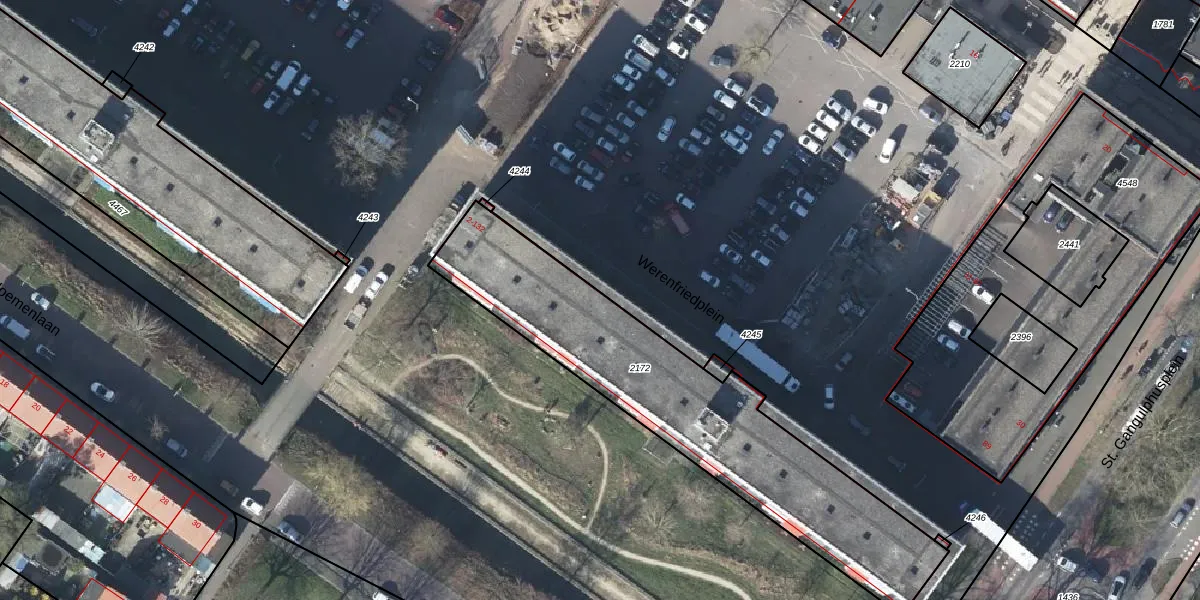Het perceel waarop Werenfriedplein 2-I staat heeft een oppervlakte van 1343 m². Dit is een zeer groot perceel. De perceeloppervlakte wordt geregistreerd door het Kadaster. Gedetailleerde informatie over de maten van dit perceel kunt u vinden in het rapport Kadastrale kaart met maatvoering van Werenfriedplein 2-I.