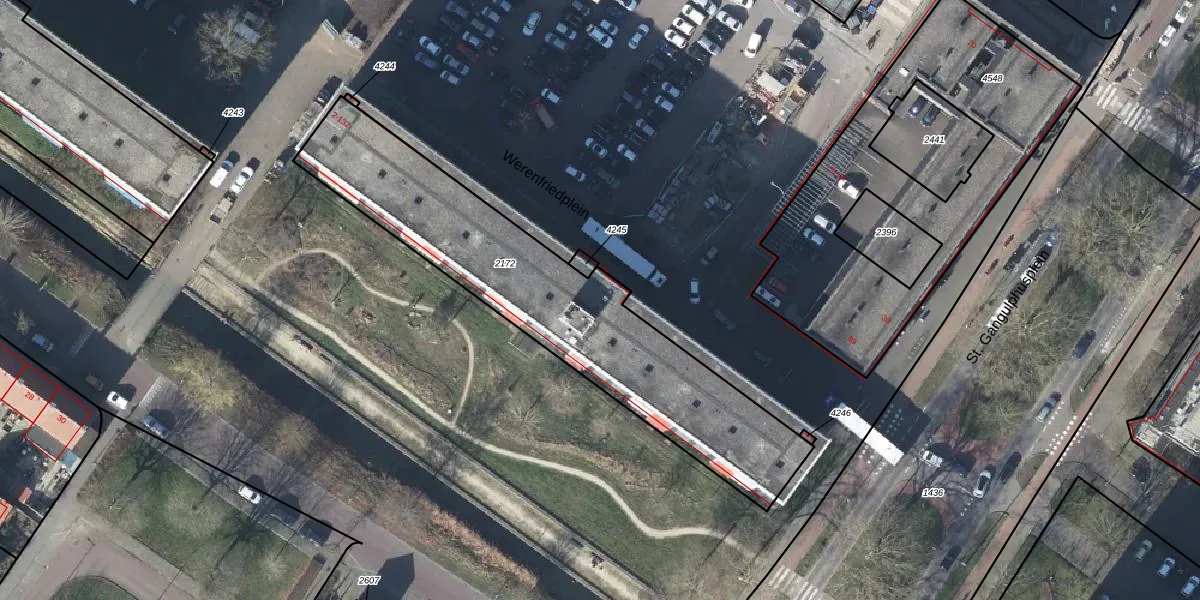 Het perceel waarop Werenfriedplein 62 staat heeft een oppervlakte van 1343 m². Dit is een zeer groot perceel. De perceeloppervlakte wordt geregistreerd door het Kadaster. Gedetailleerde informatie over de maten van dit perceel kunt u vinden in het rapport Kadastrale kaart met maatvoering van Werenfriedplein 62.