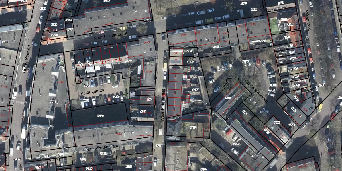 Het perceel waarop West-Peterstraat 42 staat heeft een oppervlakte van 627 m². Dit is een groot perceel. De perceeloppervlakte wordt geregistreerd door het Kadaster. Gedetailleerde informatie over de maten van dit perceel kunt u vinden in het rapport Kadastrale kaart met maatvoering van West-Peterstraat 42.