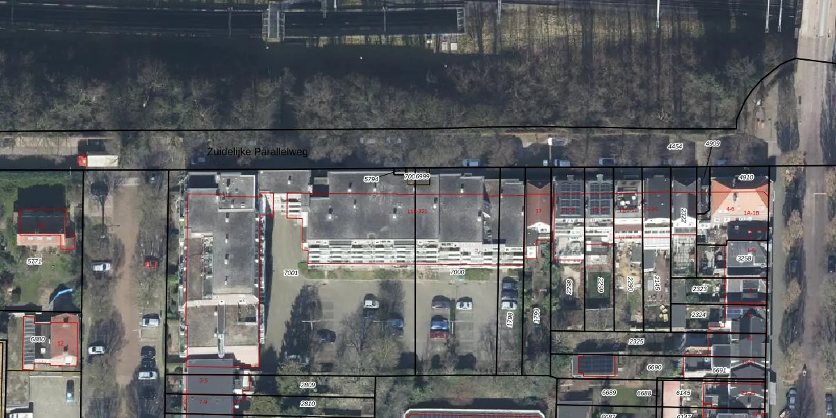 Het perceel waarop Zuidelijke Parallelweg 123 staat heeft een oppervlakte van 1015 m². Dit is een zeer groot perceel. De perceeloppervlakte wordt geregistreerd door het Kadaster. Gedetailleerde informatie over de maten van dit perceel kunt u vinden in het rapport Kadastrale kaart met maatvoering van Zuidelijke Parallelweg 123.