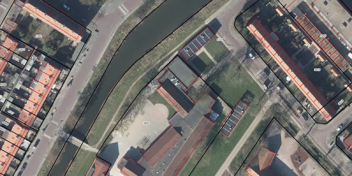Het perceel waarop Zwanebloemlaan 2 staat heeft een oppervlakte van 3870 m². Dit is een zeer groot perceel. De perceeloppervlakte wordt geregistreerd door het Kadaster. Gedetailleerde informatie over de maten van dit perceel kunt u vinden in het rapport Kadastrale kaart met maatvoering van Zwanebloemlaan 2.