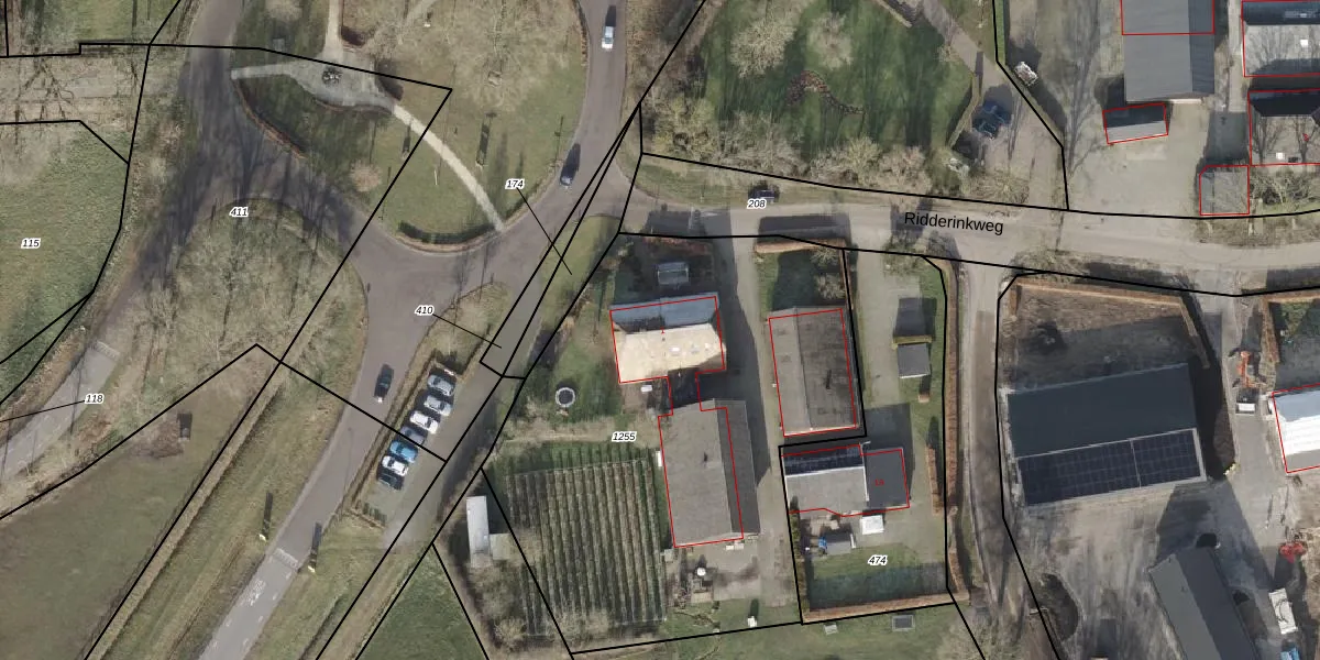 Het perceel waarop Ridderinkweg 1 staat heeft een oppervlakte van 2650 m². Dit is een zeer groot perceel. De perceeloppervlakte wordt geregistreerd door het Kadaster. Gedetailleerde informatie over de maten van dit perceel kunt u vinden in het rapport Kadastrale kaart met maatvoering van Ridderinkweg 1.