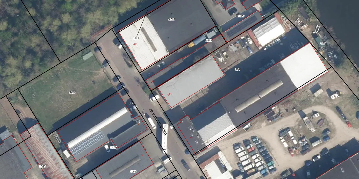 Het perceel waarop 2e industrieweg 14-c staat heeft een oppervlakte van 3770 m². Dit is een zeer groot perceel. De perceeloppervlakte wordt geregistreerd door het Kadaster. Gedetailleerde informatie over de maten van dit perceel kunt u vinden in het rapport Kadastrale kaart met maatvoering van 2e industrieweg 14-c.