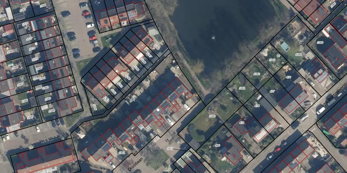 Het perceel waarop Drostlaan 95 staat heeft een oppervlakte van 3026 m². Dit is een zeer groot perceel. De perceeloppervlakte wordt geregistreerd door het Kadaster. Gedetailleerde informatie over de maten van dit perceel kunt u vinden in het rapport Kadastrale kaart met maatvoering van Drostlaan 95.