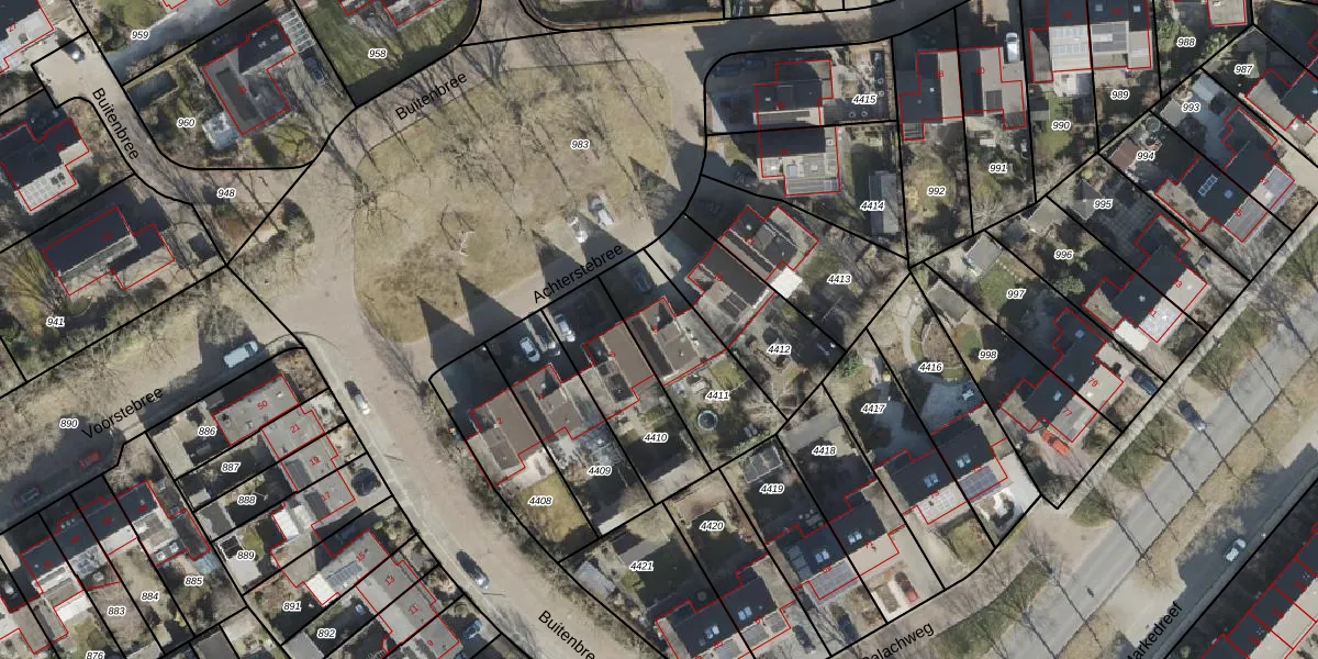 Gebruik de zoekbalk of klik op een perceel voor informatie over de adressen binnen dit perceel.