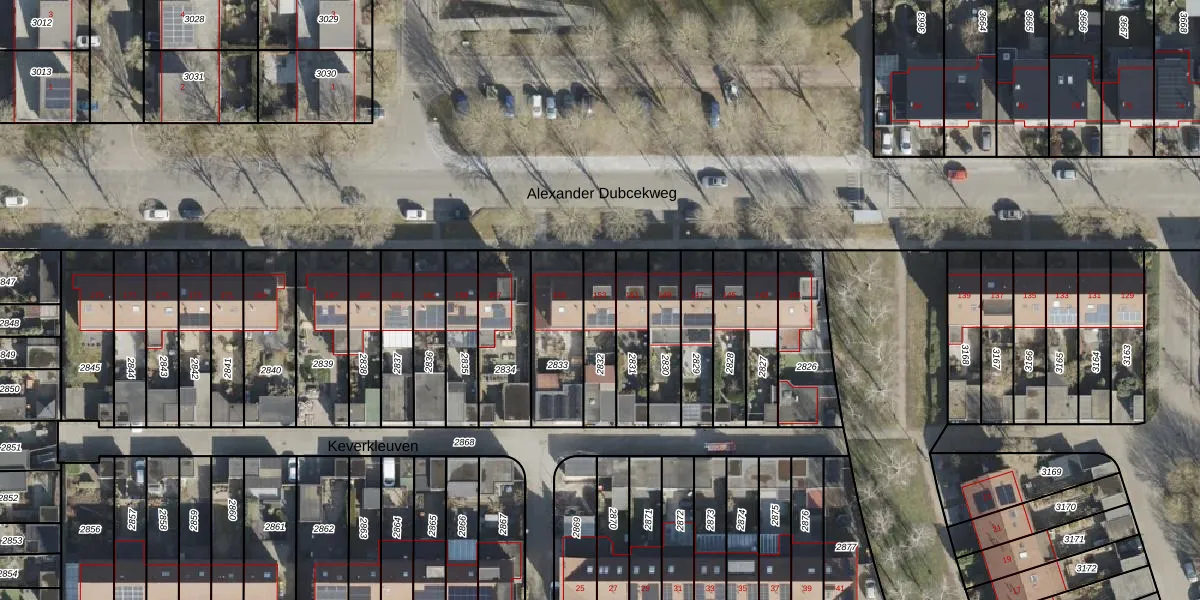 Gebruik de zoekbalk of klik op een perceel voor informatie over de adressen binnen dit perceel.