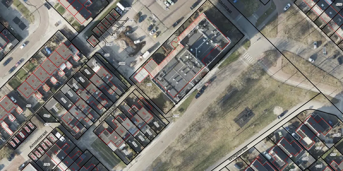 Het perceel waarop Amstelstraat 189 staat heeft een oppervlakte van 1957 m². Dit is een zeer groot perceel. De perceeloppervlakte wordt geregistreerd door het Kadaster. Gedetailleerde informatie over de maten van dit perceel kunt u vinden in het rapport Kadastrale kaart met maatvoering van Amstelstraat 189.
