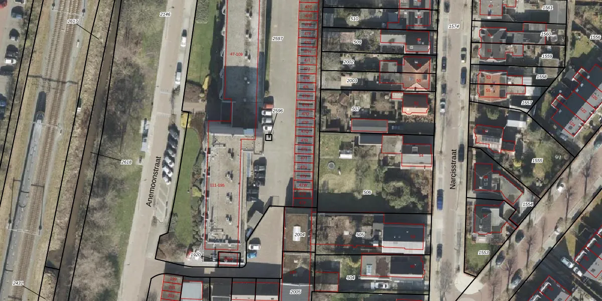 Het perceel waarop Anemoonstraat 47-S staat heeft een oppervlakte van 6635 m². Dit is een zeer groot perceel. De perceeloppervlakte wordt geregistreerd door het Kadaster. Gedetailleerde informatie over de maten van dit perceel kunt u vinden in het rapport Kadastrale kaart met maatvoering van Anemoonstraat 47-S.