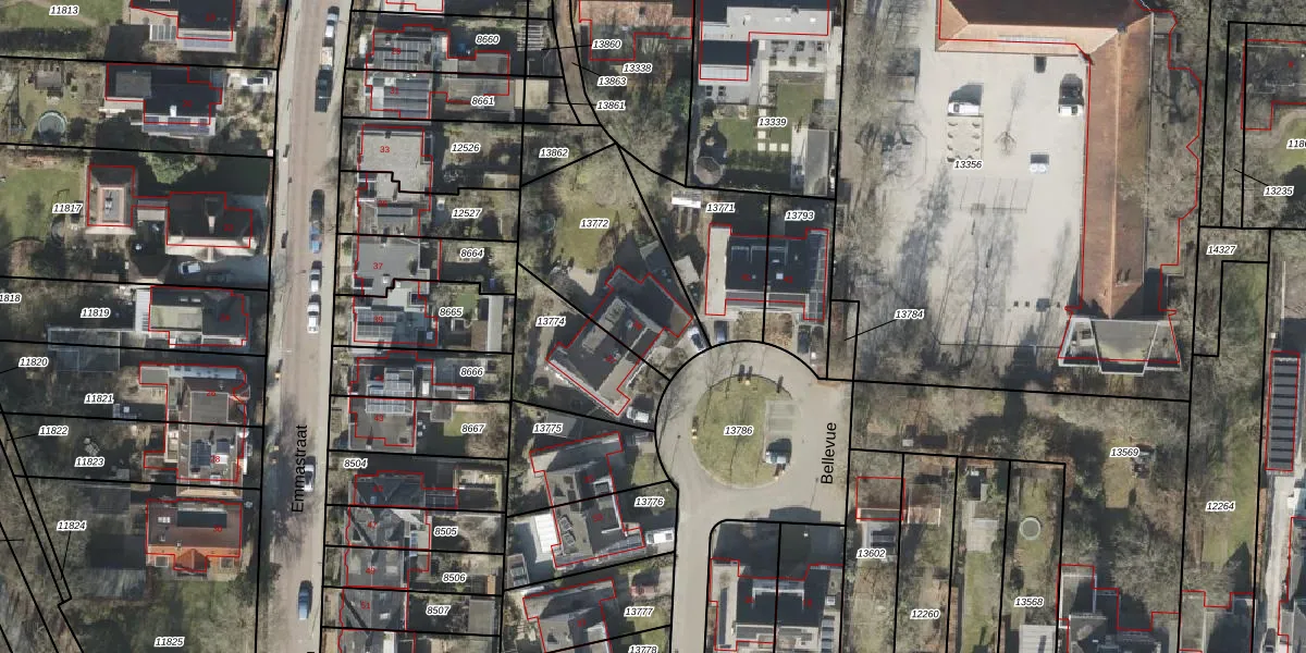 Het perceel waarop Bellevue 39 staat heeft een oppervlakte van 565 m². Dit is een groot perceel. De perceeloppervlakte wordt geregistreerd door het Kadaster. Gedetailleerde informatie over de maten van dit perceel kunt u vinden in het rapport Kadastrale kaart met maatvoering van Bellevue 39.