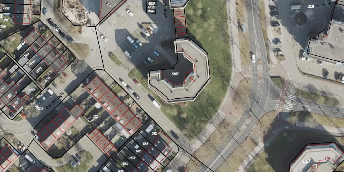 Het perceel waarop Beunheugte 60 staat heeft een oppervlakte van 774 m². Dit is een groot perceel. De perceeloppervlakte wordt geregistreerd door het Kadaster. Gedetailleerde informatie over de maten van dit perceel kunt u vinden in het rapport Kadastrale kaart met maatvoering van Beunheugte 60.