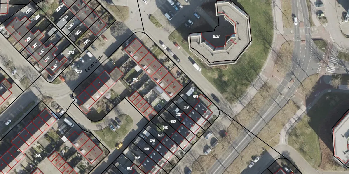 Het perceel waarop Beunheugte 65 staat heeft een oppervlakte van 1970 m². Dit is een zeer groot perceel. De perceeloppervlakte wordt geregistreerd door het Kadaster. Gedetailleerde informatie over de maten van dit perceel kunt u vinden in het rapport Kadastrale kaart met maatvoering van Beunheugte 65.