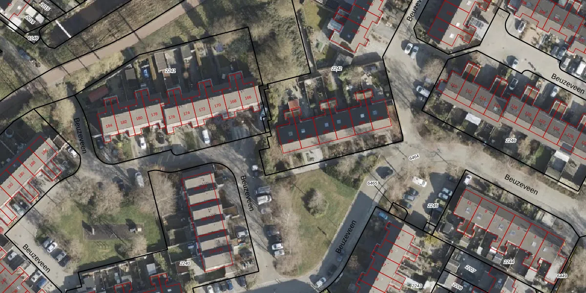 Het perceel waarop Beuzeveen 164 staat heeft een oppervlakte van 2960 m². Dit is een zeer groot perceel. De perceeloppervlakte wordt geregistreerd door het Kadaster. Gedetailleerde informatie over de maten van dit perceel kunt u vinden in het rapport Kadastrale kaart met maatvoering van Beuzeveen 164.