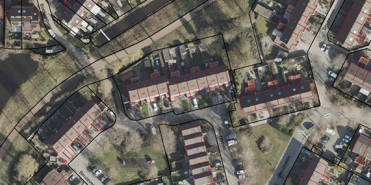 Het perceel waarop Beuzeveen 174 staat heeft een oppervlakte van 2960 m². Dit is een zeer groot perceel. De perceeloppervlakte wordt geregistreerd door het Kadaster. Gedetailleerde informatie over de maten van dit perceel kunt u vinden in het rapport Kadastrale kaart met maatvoering van Beuzeveen 174.