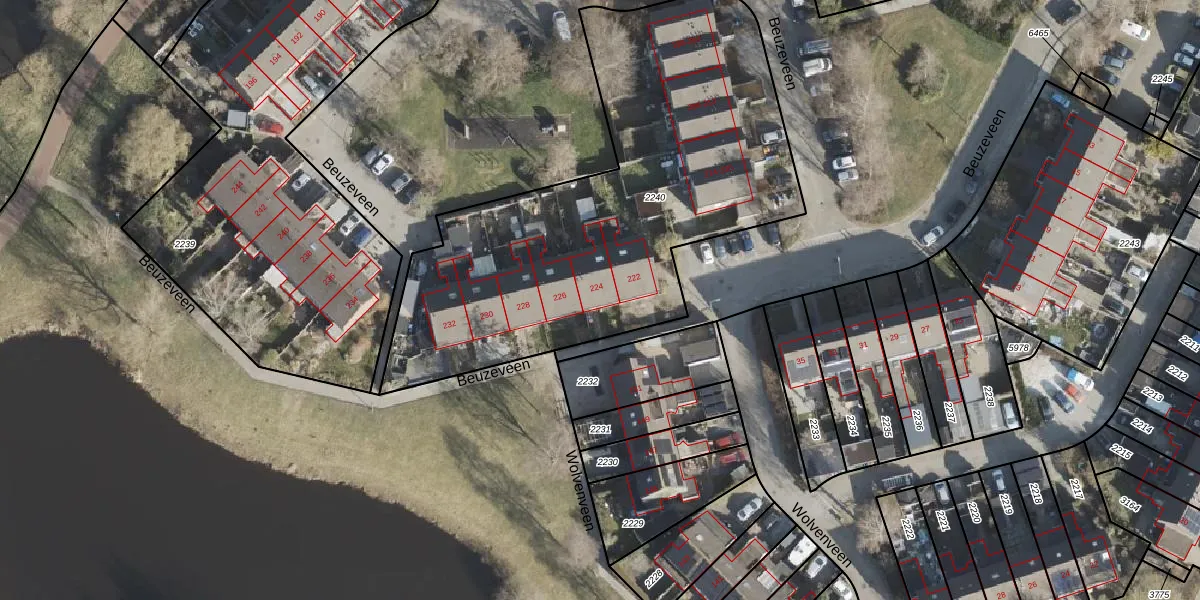 Het perceel waarop Beuzeveen 224 staat heeft een oppervlakte van 2269 m². Dit is een zeer groot perceel. De perceeloppervlakte wordt geregistreerd door het Kadaster. Gedetailleerde informatie over de maten van dit perceel kunt u vinden in het rapport Kadastrale kaart met maatvoering van Beuzeveen 224.