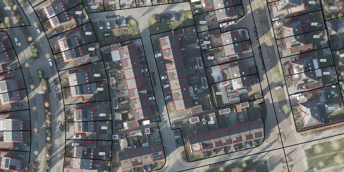 Het perceel waarop Bosbes 6 staat heeft een oppervlakte van 2674 m². Dit is een zeer groot perceel. De perceeloppervlakte wordt geregistreerd door het Kadaster. Gedetailleerde informatie over de maten van dit perceel kunt u vinden in het rapport Kadastrale kaart met maatvoering van Bosbes 6.