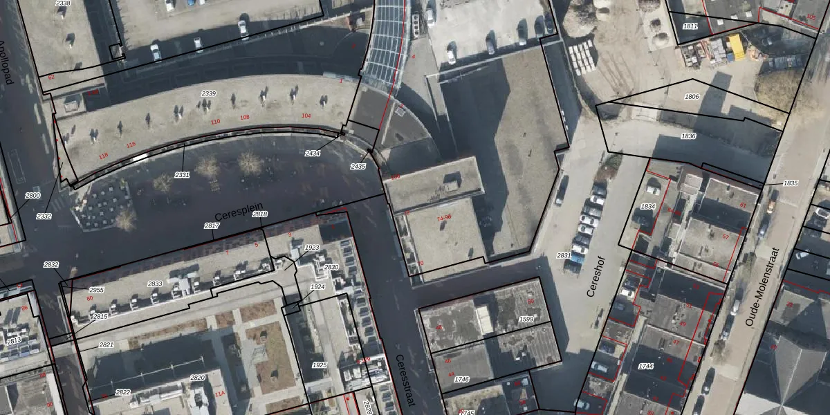 Het perceel waarop Ceresplein 78 staat heeft een oppervlakte van 9967 m². Dit is een zeer groot perceel. De perceeloppervlakte wordt geregistreerd door het Kadaster. Gedetailleerde informatie over de maten van dit perceel kunt u vinden in het rapport Kadastrale kaart met maatvoering van Ceresplein 78.