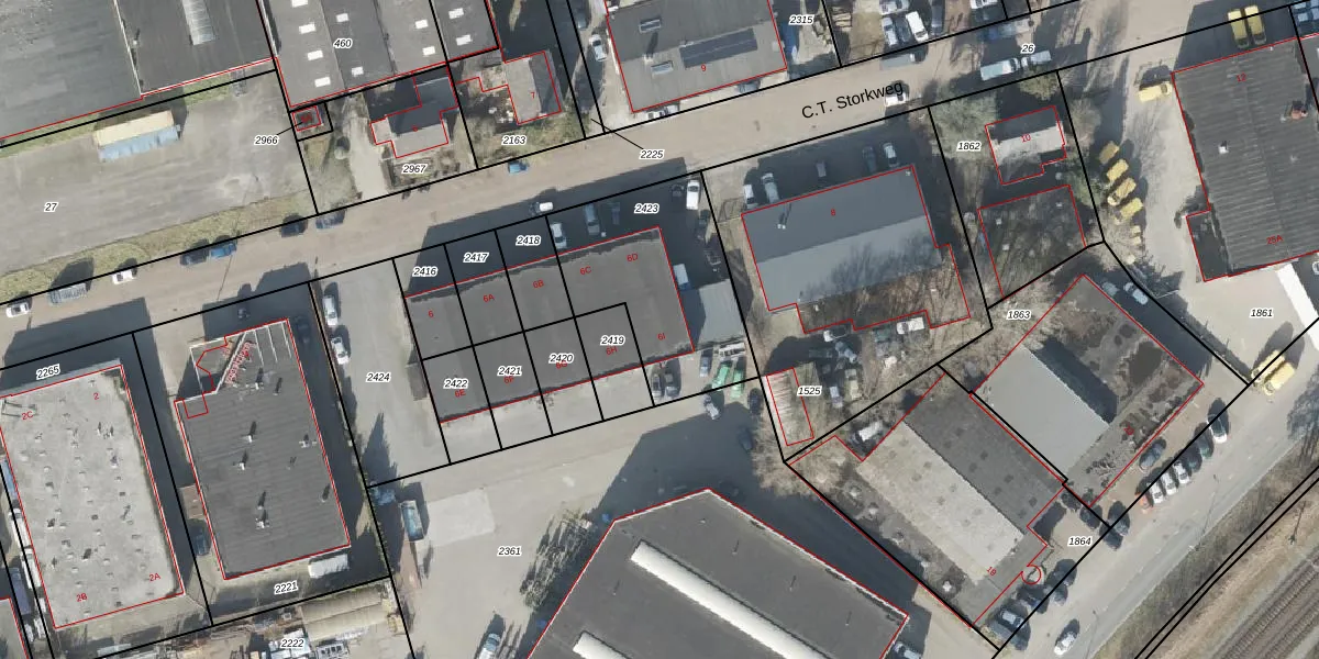 Het perceel waarop C.T. Storkweg 6-I staat heeft een oppervlakte van 667 m². Dit is een groot perceel. De perceeloppervlakte wordt geregistreerd door het Kadaster. Gedetailleerde informatie over de maten van dit perceel kunt u vinden in het rapport Kadastrale kaart met maatvoering van C.T. Storkweg 6-I.