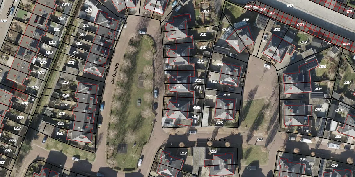 Het perceel waarop De Gaarde 58 staat heeft een oppervlakte van 176 m². Dit is een middelgroot perceel. De perceeloppervlakte wordt geregistreerd door het Kadaster. Gedetailleerde informatie over de maten van dit perceel kunt u vinden in het rapport Kadastrale kaart met maatvoering van De Gaarde 58.