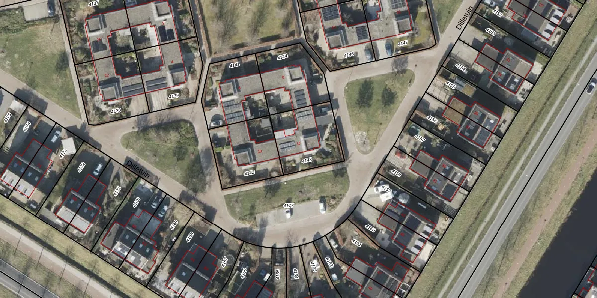 Het perceel waarop Dilletuin 18 staat heeft een oppervlakte van 433 m². Dit is een groot perceel. De perceeloppervlakte wordt geregistreerd door het Kadaster. Gedetailleerde informatie over de maten van dit perceel kunt u vinden in het rapport Kadastrale kaart met maatvoering van Dilletuin 18.