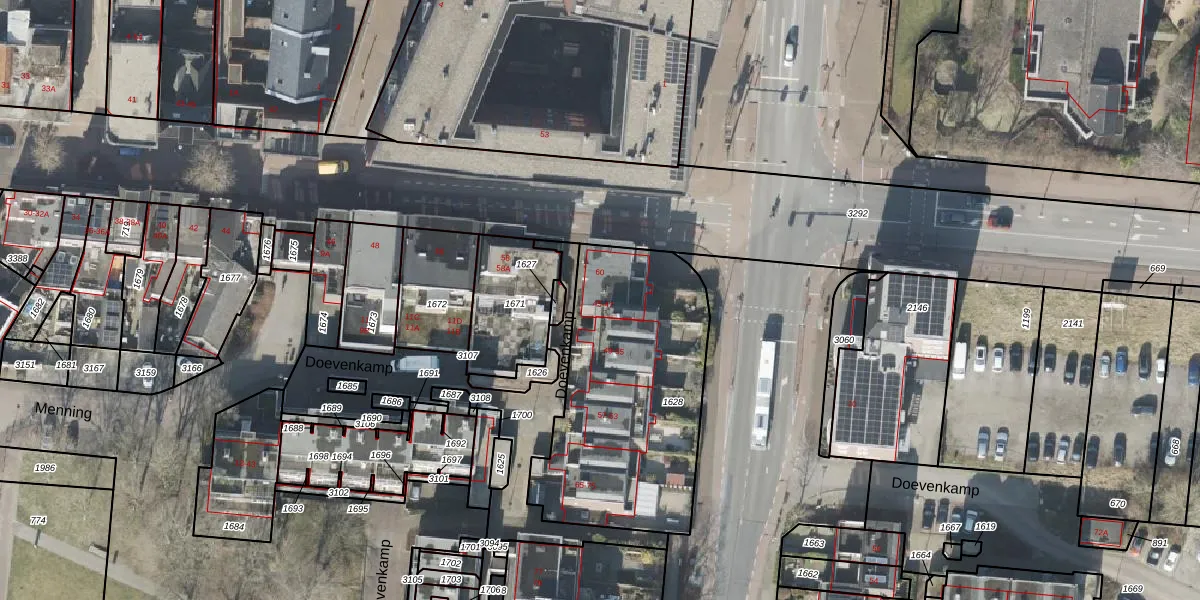 Het perceel waarop Doevenkamp 45 staat heeft een oppervlakte van 1097 m². Dit is een zeer groot perceel. De perceeloppervlakte wordt geregistreerd door het Kadaster. Gedetailleerde informatie over de maten van dit perceel kunt u vinden in het rapport Kadastrale kaart met maatvoering van Doevenkamp 45.