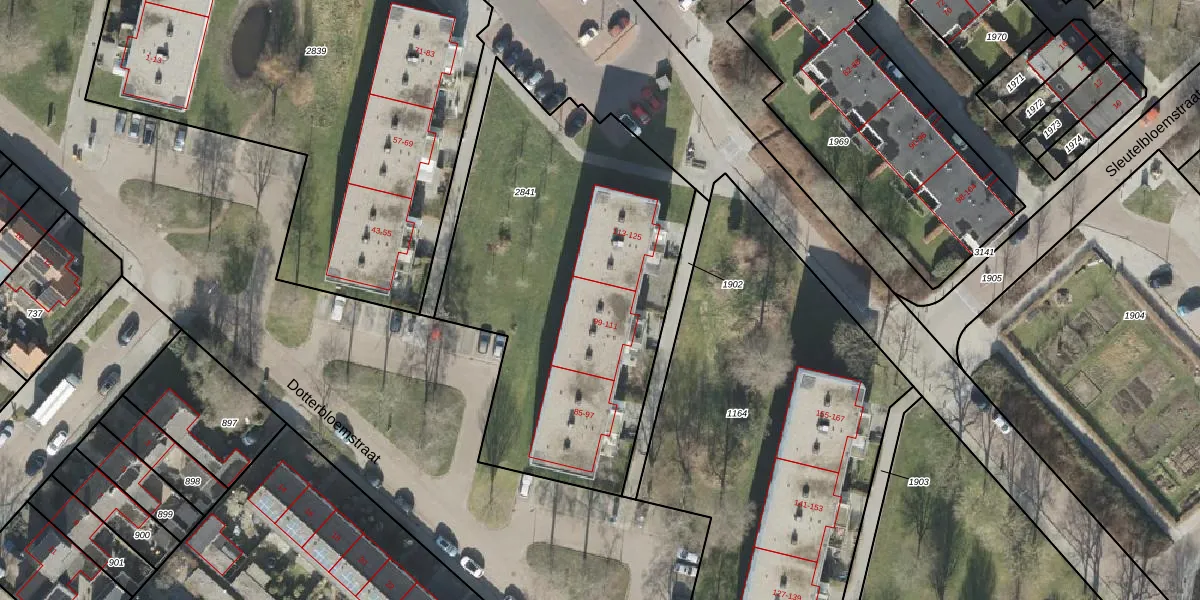 Het perceel waarop Dotterbloemstraat 105 staat heeft een oppervlakte van 1950 m². Dit is een zeer groot perceel. De perceeloppervlakte wordt geregistreerd door het Kadaster. Gedetailleerde informatie over de maten van dit perceel kunt u vinden in het rapport Kadastrale kaart met maatvoering van Dotterbloemstraat 105.