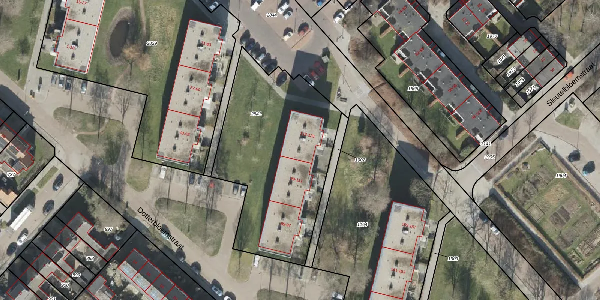 Het perceel waarop Dotterbloemstraat 121 staat heeft een oppervlakte van 1950 m². Dit is een zeer groot perceel. De perceeloppervlakte wordt geregistreerd door het Kadaster. Gedetailleerde informatie over de maten van dit perceel kunt u vinden in het rapport Kadastrale kaart met maatvoering van Dotterbloemstraat 121.