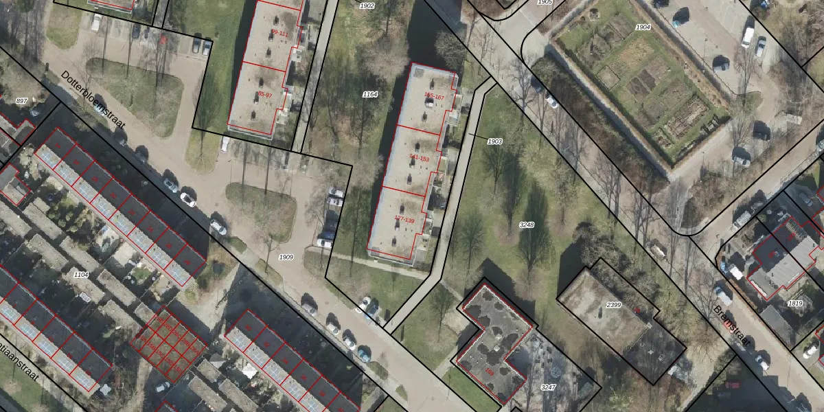 Het perceel waarop Dotterbloemstraat 129 staat heeft een oppervlakte van 2430 m². Dit is een zeer groot perceel. De perceeloppervlakte wordt geregistreerd door het Kadaster. Gedetailleerde informatie over de maten van dit perceel kunt u vinden in het rapport Kadastrale kaart met maatvoering van Dotterbloemstraat 129.