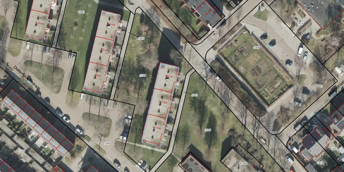 Het perceel waarop Dotterbloemstraat 155 staat heeft een oppervlakte van 2430 m². Dit is een zeer groot perceel. De perceeloppervlakte wordt geregistreerd door het Kadaster. Gedetailleerde informatie over de maten van dit perceel kunt u vinden in het rapport Kadastrale kaart met maatvoering van Dotterbloemstraat 155.