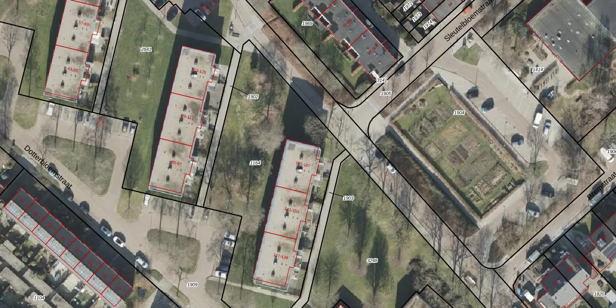Het perceel waarop Dotterbloemstraat 157 staat heeft een oppervlakte van 2430 m². Dit is een zeer groot perceel. De perceeloppervlakte wordt geregistreerd door het Kadaster. Gedetailleerde informatie over de maten van dit perceel kunt u vinden in het rapport Kadastrale kaart met maatvoering van Dotterbloemstraat 157.