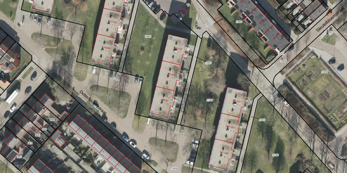Het perceel waarop Dotterbloemstraat 99 staat heeft een oppervlakte van 1950 m². Dit is een zeer groot perceel. De perceeloppervlakte wordt geregistreerd door het Kadaster. Gedetailleerde informatie over de maten van dit perceel kunt u vinden in het rapport Kadastrale kaart met maatvoering van Dotterbloemstraat 99.