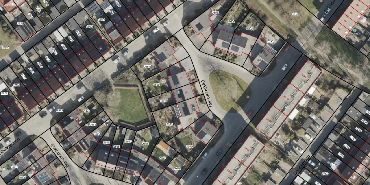 Het perceel waarop Eekhoornslag 45 staat heeft een oppervlakte van 224 m². Dit is een middelgroot perceel. De perceeloppervlakte wordt geregistreerd door het Kadaster. Gedetailleerde informatie over de maten van dit perceel kunt u vinden in het rapport Kadastrale kaart met maatvoering van Eekhoornslag 45.