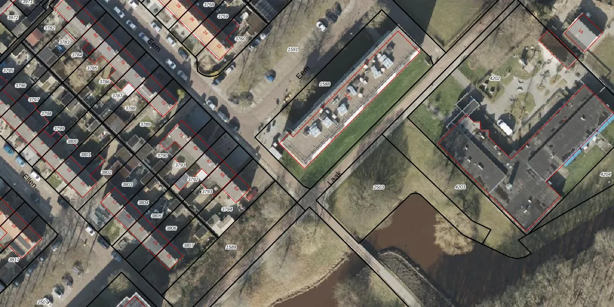 Het perceel waarop Eem 43 staat heeft een oppervlakte van 1438 m². Dit is een zeer groot perceel. De perceeloppervlakte wordt geregistreerd door het Kadaster. Gedetailleerde informatie over de maten van dit perceel kunt u vinden in het rapport Kadastrale kaart met maatvoering van Eem 43.