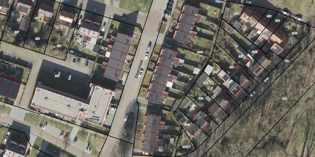 Het perceel waarop Eiberstraat 15 staat heeft een oppervlakte van 3316 m². Dit is een zeer groot perceel. De perceeloppervlakte wordt geregistreerd door het Kadaster. Gedetailleerde informatie over de maten van dit perceel kunt u vinden in het rapport Kadastrale kaart met maatvoering van Eiberstraat 15.