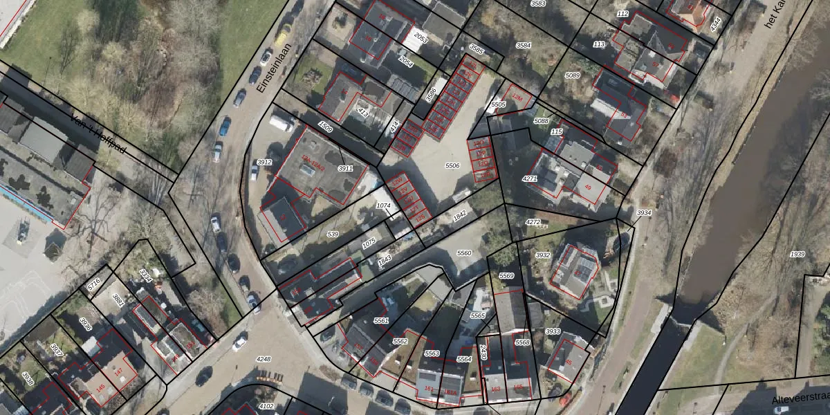 Het perceel waarop Einsteinlaan 12-T staat heeft een oppervlakte van 687 m². Dit is een groot perceel. De perceeloppervlakte wordt geregistreerd door het Kadaster. Gedetailleerde informatie over de maten van dit perceel kunt u vinden in het rapport Kadastrale kaart met maatvoering van Einsteinlaan 12-T.