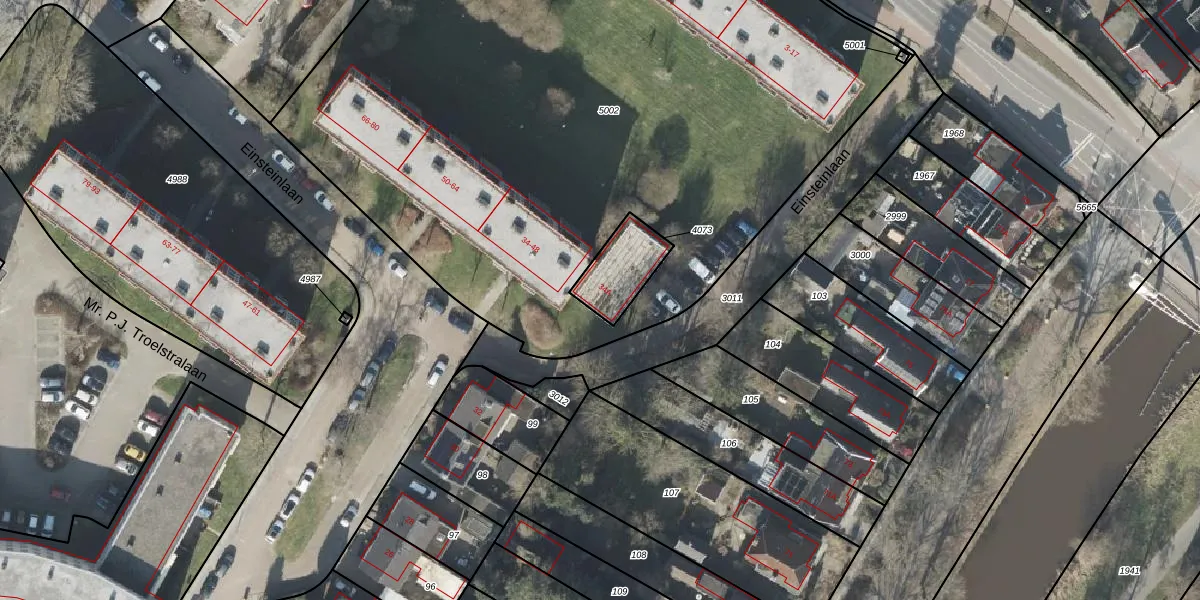 Het perceel waarop Einsteinlaan 34-A staat heeft een oppervlakte van 153 m². Dit is een middelgroot perceel. De perceeloppervlakte wordt geregistreerd door het Kadaster. Gedetailleerde informatie over de maten van dit perceel kunt u vinden in het rapport Kadastrale kaart met maatvoering van Einsteinlaan 34-A.