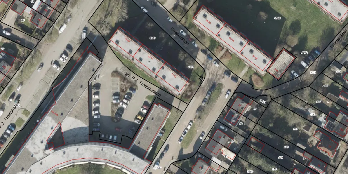Het perceel waarop Einsteinlaan 53 staat heeft een oppervlakte van 1997 m². Dit is een zeer groot perceel. De perceeloppervlakte wordt geregistreerd door het Kadaster. Gedetailleerde informatie over de maten van dit perceel kunt u vinden in het rapport Kadastrale kaart met maatvoering van Einsteinlaan 53.