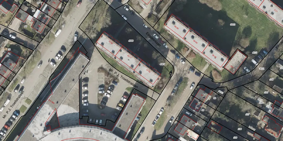 Het perceel waarop Einsteinlaan 59 staat heeft een oppervlakte van 1997 m². Dit is een zeer groot perceel. De perceeloppervlakte wordt geregistreerd door het Kadaster. Gedetailleerde informatie over de maten van dit perceel kunt u vinden in het rapport Kadastrale kaart met maatvoering van Einsteinlaan 59.