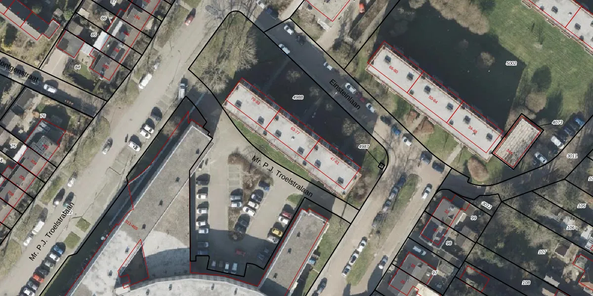Het perceel waarop Einsteinlaan 69 staat heeft een oppervlakte van 1997 m². Dit is een zeer groot perceel. De perceeloppervlakte wordt geregistreerd door het Kadaster. Gedetailleerde informatie over de maten van dit perceel kunt u vinden in het rapport Kadastrale kaart met maatvoering van Einsteinlaan 69.