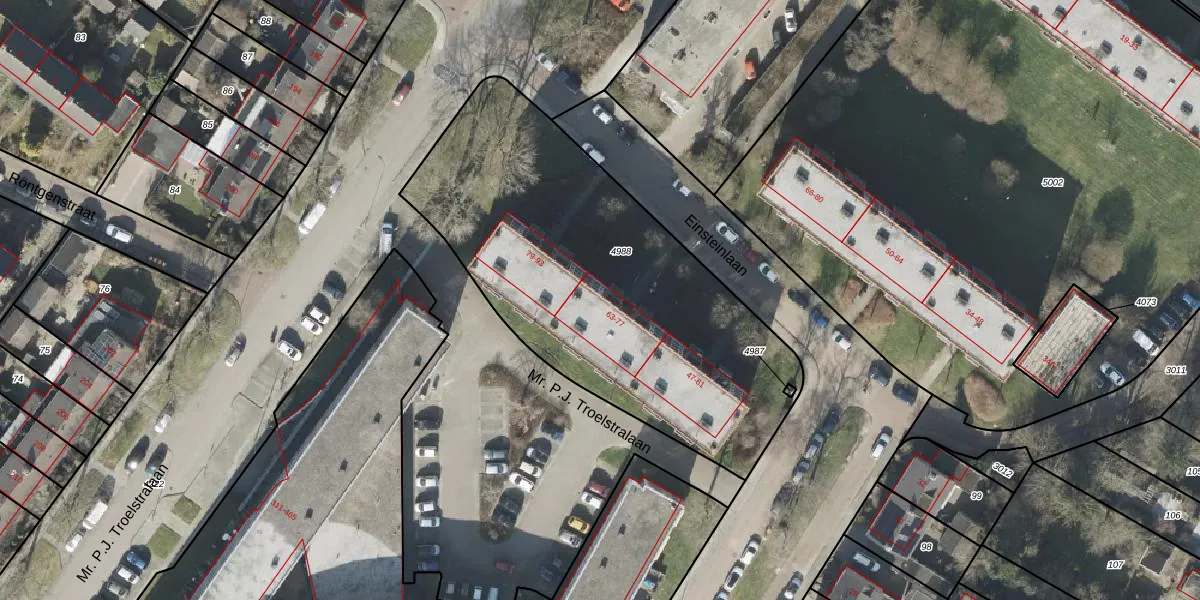 Het perceel waarop Einsteinlaan 71 staat heeft een oppervlakte van 1997 m². Dit is een zeer groot perceel. De perceeloppervlakte wordt geregistreerd door het Kadaster. Gedetailleerde informatie over de maten van dit perceel kunt u vinden in het rapport Kadastrale kaart met maatvoering van Einsteinlaan 71.
