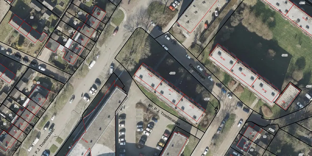 Het perceel waarop Einsteinlaan 79 staat heeft een oppervlakte van 1997 m². Dit is een zeer groot perceel. De perceeloppervlakte wordt geregistreerd door het Kadaster. Gedetailleerde informatie over de maten van dit perceel kunt u vinden in het rapport Kadastrale kaart met maatvoering van Einsteinlaan 79.