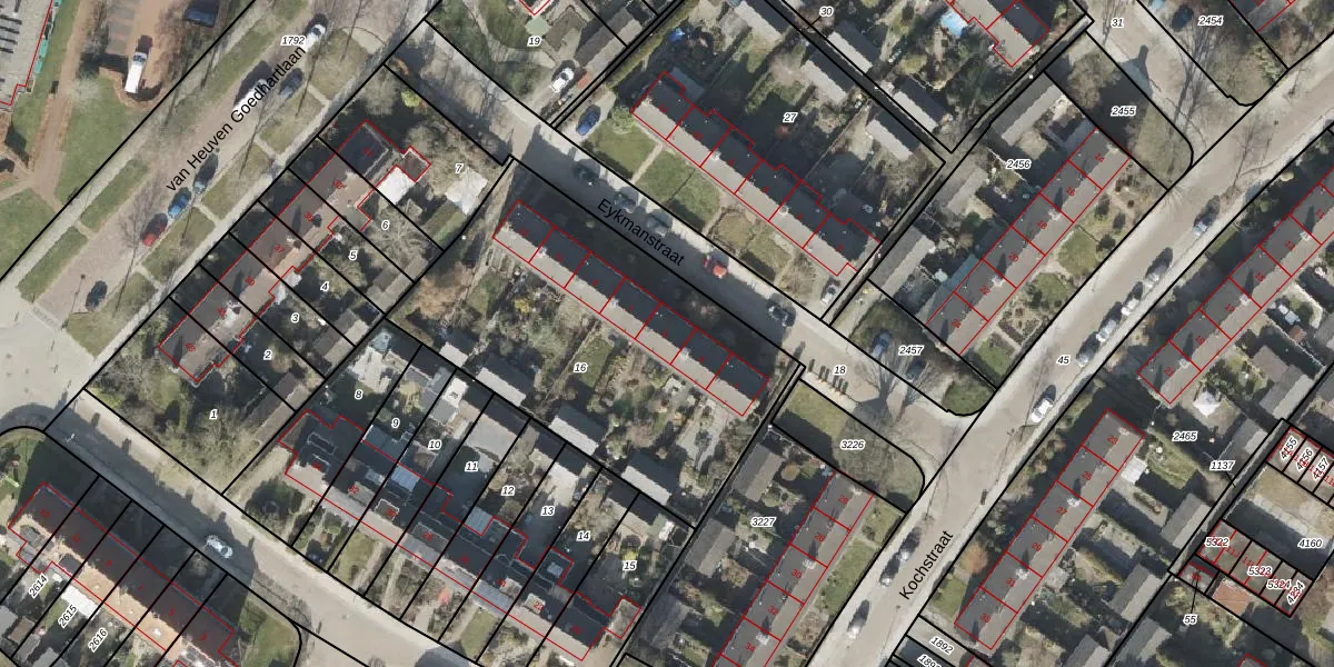 Het perceel waarop Eykmanstraat 5 staat heeft een oppervlakte van 1629 m². Dit is een zeer groot perceel. De perceeloppervlakte wordt geregistreerd door het Kadaster. Gedetailleerde informatie over de maten van dit perceel kunt u vinden in het rapport Kadastrale kaart met maatvoering van Eykmanstraat 5.