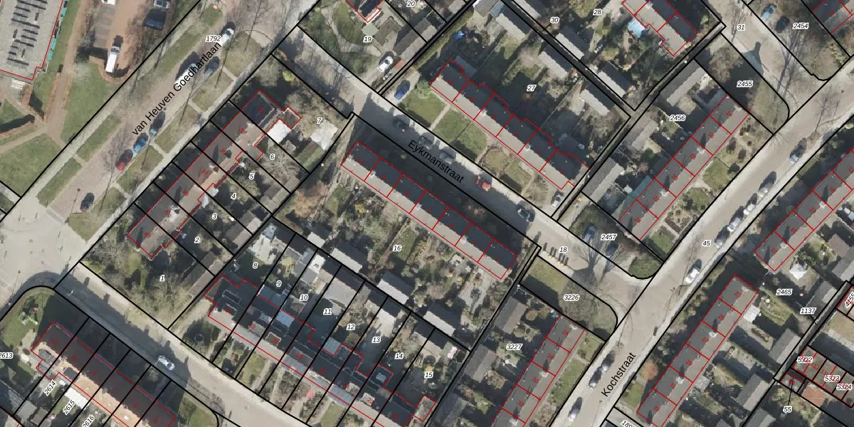 Het perceel waarop Eykmanstraat 7 staat heeft een oppervlakte van 1629 m². Dit is een zeer groot perceel. De perceeloppervlakte wordt geregistreerd door het Kadaster. Gedetailleerde informatie over de maten van dit perceel kunt u vinden in het rapport Kadastrale kaart met maatvoering van Eykmanstraat 7.