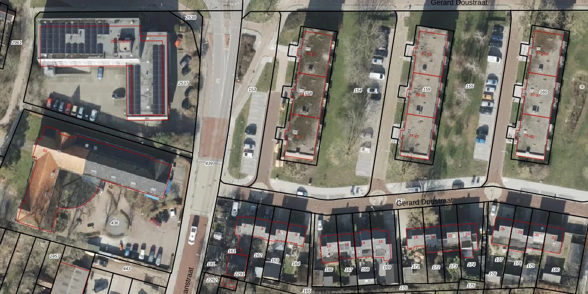 Het perceel waarop Gerard Doustraat 1 staat heeft een oppervlakte van 617 m². Dit is een groot perceel. De perceeloppervlakte wordt geregistreerd door het Kadaster. Gedetailleerde informatie over de maten van dit perceel kunt u vinden in het rapport Kadastrale kaart met maatvoering van Gerard Doustraat 1.